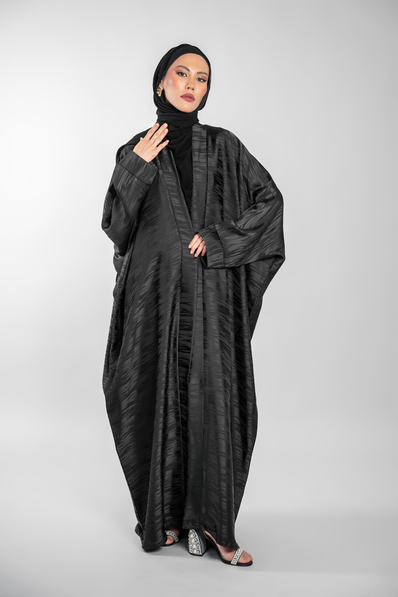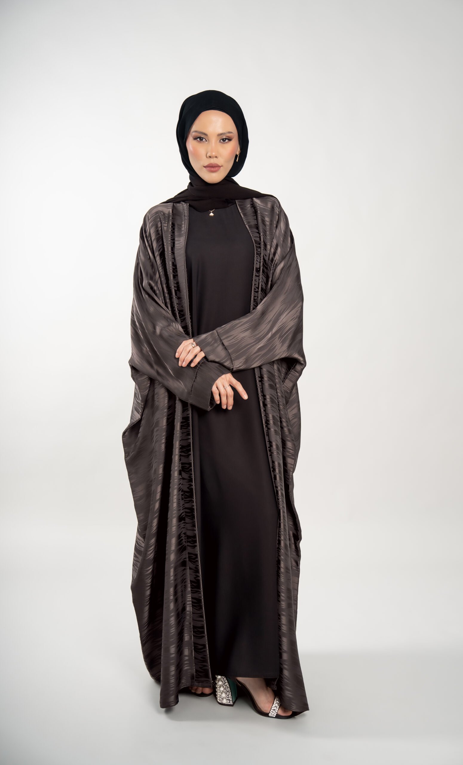 Inspired by the golden dunes and the night sky of the Qatari desert, this stunning collection is designed to carry you from day into the night. The abaya offers an open-front design, worn over a short-sleeve dress creating a soft, flowing elegance for graceful movement. The coordinating hijab is crafted from a soft chiffon that completes this sophisticated look. Available in tan, black and grey. Sizes small, medium, large and extra-large.